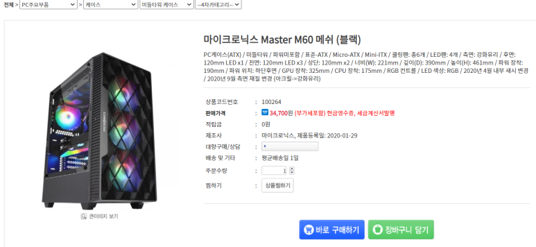 스펙: RGB 헥사팬(상단 제외), 먼지필터, ATX 지원, 측면 강화유리 등