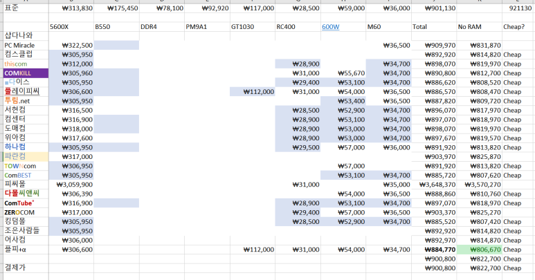 우선, 저는 다나와(https://danawa.com)를 통해 부품 가격을 계속 비교해왔습니다. 사고자 하는 부품을 즐겨찾기에 저장해두고, 엑셀로 만들어서 수시로 가격 변동 추세를 작성해왔어요.