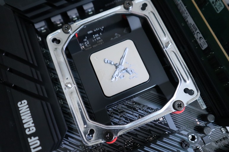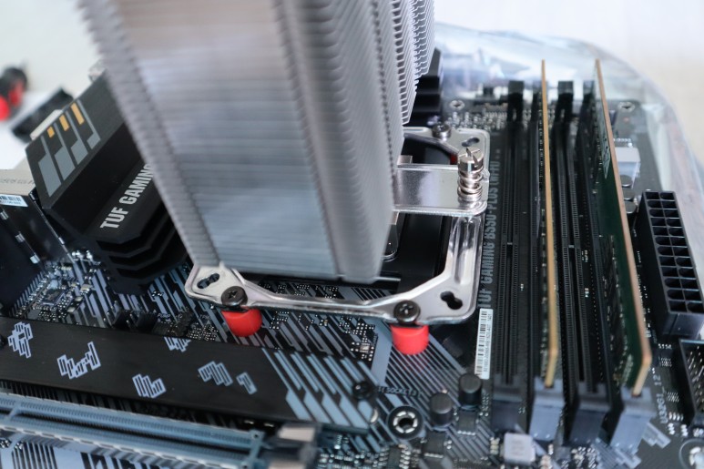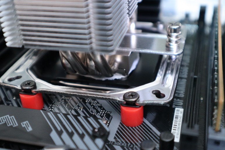 되었으면, 나사를 돌려서 쿨러를 단단하게 채결합니다. 지금 벌써 서멀이 삐져나온 게 보이는데...저 정도는 큰 문제 없습니다. 무뽑 가이드도 써멀을 받쳐주는 역할을 하기 때문에 저 정도 삐져나온다고 망가지진 않아요. 물론 저게 보드에 닿을 정도라면... RIP.