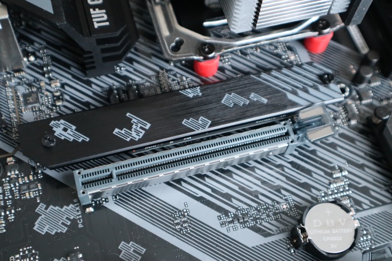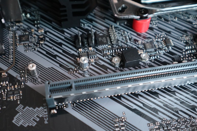 M.2 지지대가 있는데, 메인보드에 동봉된 작은 부품을 꺼내 여기에 덧붙여줍니다. 단면 SSD일 때는 이 작업이 필수입니다. 양면일 때는 공간이 어차피 채워지기 때문에 하면 안 됩니다. 살짝 까다롭긴 한데..그래도 방열을 위한 것일테니..참아야겠죠.