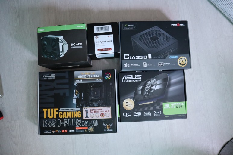 제가 사용할 부품들입니다. 오른쪽 상단부터 3RSYS RC 400, 라이젠 5 5600X, 마이크로닉스 클래식 2 600W, ASUS TUF GAMING B550 PLUS Wi-Fi, ASUS GT1030입니다. 저 그래픽 카드 구하느라 고생했네요, 어후.