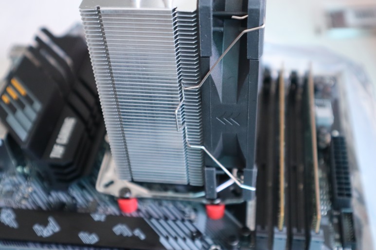 양 옆 나사구멍에 잘 맞추어 히트싱크를 결착합니다. 이때 계속 들고 움직이면 서멀구리스가 번질 수 있으니 한 번에 잘 맞추는 게 중요합니다.