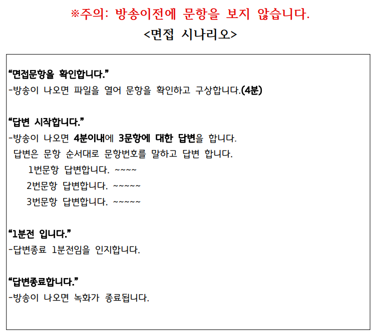 이런 식으로 면접이 진행될 겁니다. 검은색 따옴표 안에 있는 문장이 안내 멘트입니다.