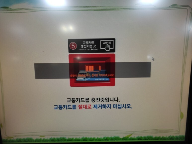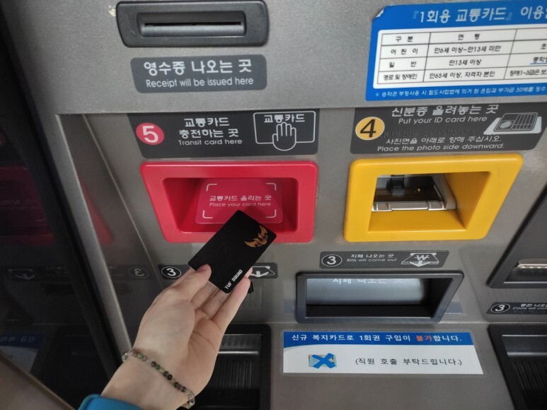 근처 역사 내 무인 카드 충전기를 이용했습니다. 시간이 좀 걸리기 때문에, 가급적 사람들이 없는 시간에 방문하는 것을 추천드려요. 교통카드를 올려놓으세요.