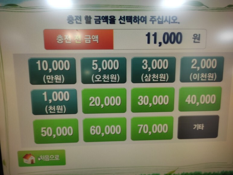 그럼 이제 충전을 시작해볼까요. 충전은 1000원 단위로만 가능합니다. 단, 이때 한 번에 투입할 수 있는 동전의 개수는 20개입니다. 그래서 100원 동전으로 충전하신다면 2000원 노가다를 하셔야 합니다. 500원이면 바로 10000원을 넣을 수 있지만...불편하긴 하더라고요.