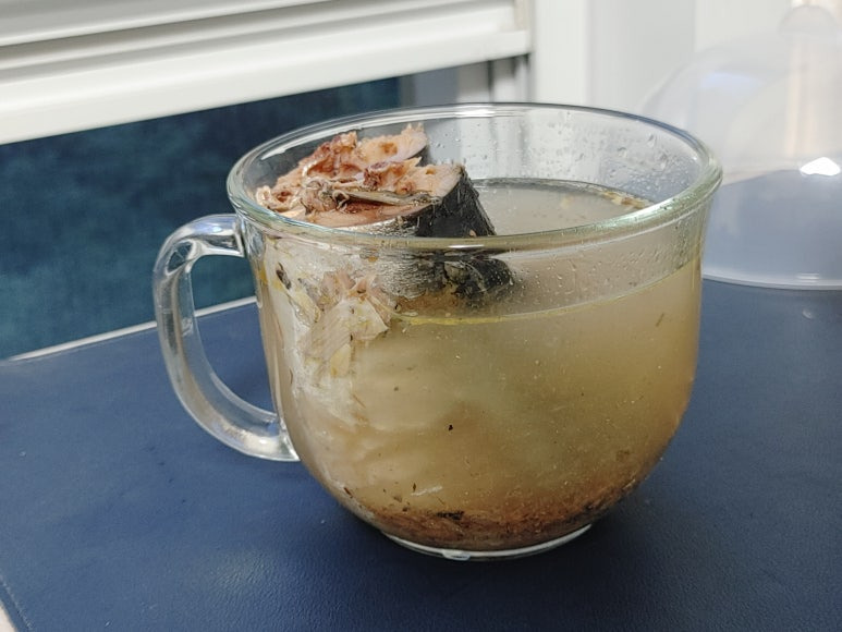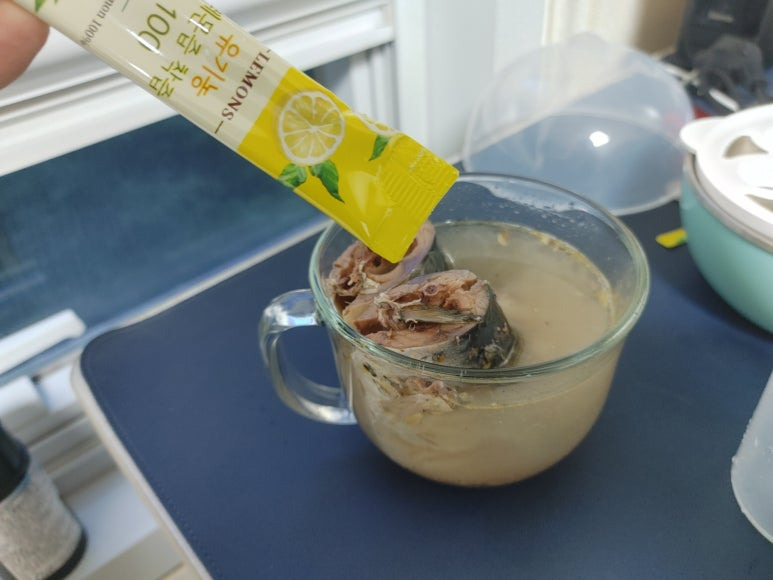학과 행사에서 받은 시리얼컵에 뜨거운 물을 받아주고 고등어를 넣습니다. 이러라고 있는 레몬즙이 아니지만, 비린내를 잡기 위해 이 정체모를 탕에 투하해줍니다. 반만 넣고, 반은 아까우니까 그냥 마십시다.