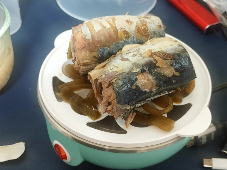 햇반을 하나 개봉하여 곁들이면 매우 좋습니다. 간장 양념에 절여진 궁채의 향이 고등어에 배여 꽤 독특한 감칠맛이 나고, 궁채도 부드럽게 익어 고등어 살과 함께 먹으면 아삭거리는 식감이 고등어의 풍미를 높여줍니다. 에그쿠커 하나만으로 이 정도의 요리가 나오는 게 꽤나 괜찮습니다.