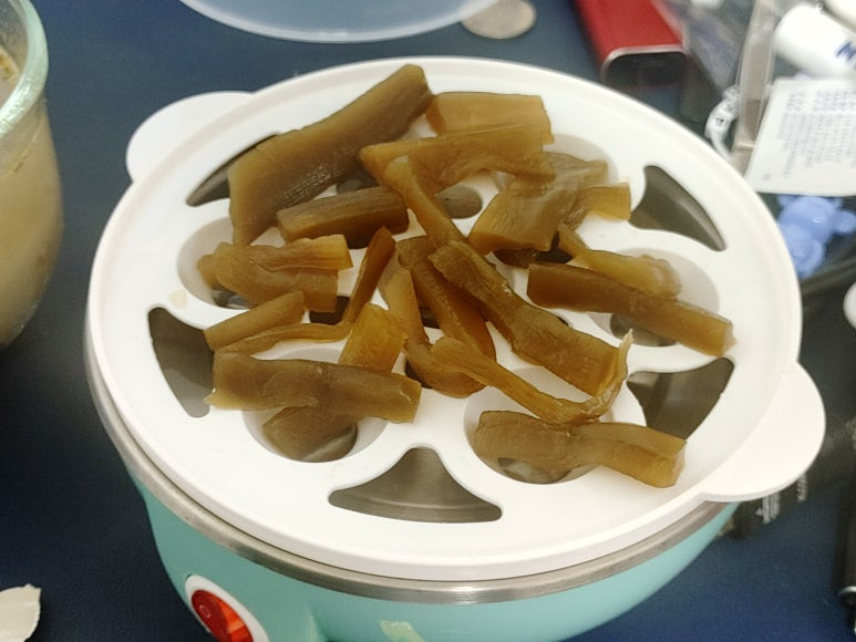 부모님께 받은 궁채절임 반찬이 있었습니다. 저는 이런 걸 별로 좋아하지 않아서 먹진 않고 있었습니다만, 오늘은 유용하게 쓰일 수 있을 것 같군요. 에그쿠커의 구멍을 조심하며 궁채를 깔아줍니다.